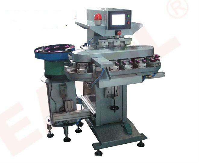 大多數(shù)移印機,尤其是大型移印機,一般都使用固定油盤和油盅,這類移印機的機械構(gòu)造比較簡單卻很堅固。移印頭的進出由滑行組件帶動,由于印頭滑行組件所產(chǎn)生的撞擊,無可避免地會產(chǎn)生移印頭的震動,從而限制機體的印刷速度。